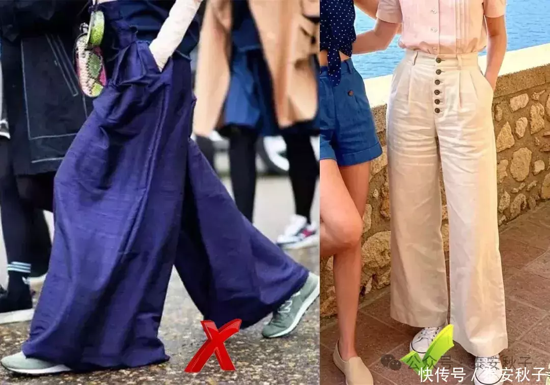 其实这种裤子极容易翻车,要是咱们的身高不够,就要避开这种裤型。选九分、或是露鞋尖的阔腿裤来穿,既时髦显瘦,又很显高。